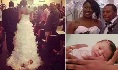 Невеста Шона Картер-Брукс (Shona Carter-Brooks) из города Джексон, расположенного недалеко от столицы штата Тенннеси, появилась в баптистской церкви в белоснежном платье от американского модельера Веры Вонг. Однако внимание гостей торжественной церемонии привлек не роскошный наряд, а новорожденная девочка по имени Обри, лежащая на его шлейфе.