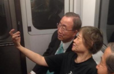 Генеральный секретарь ООН Пан Ги Мун сфотографировался в метро с одной из пассажирок. Как передает SİA со ссылкой на Lenta.ru, о сделанном при помощи телефона снимке сообщил в Twitter его пресс-секретарь.