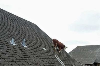 Сначала он не поверил своим глазам и решил, что его подводит зрение. Но остановившись понял, что на черепице действительно балансирует корова. Штайнер не смог упустить такой момент и сфотографировал отчаянную "эквилибристку".