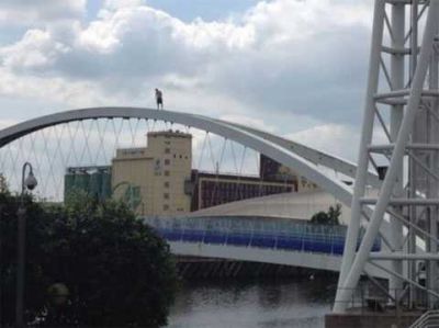 Жители Манчестера стали свидетелями шокирующего момента, когда желающий спастись от жары подросток взобрался на арку огромного разводного моста и прыгнул с высоты более 15 метров в воду.