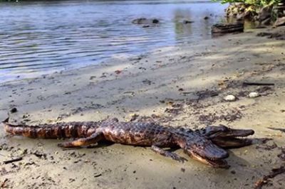 "Я выгуливал свою собаку у реки и заметил группу людей, разглядывавших что-то на берегу. Когда я подошел ближе, то с изумлением увидел двухголового аллигатора", — подписал Арнолд опубликованный в соцсети снимок.