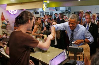 После выступления с речью в техасском Остине 10 июля, президент США Барак Обама посетил местную закусочную, сообщает The New York Post. Как передает SİA со ссылкой на Lenta.ru, глава Белого дома проигнорировал типичную для популярного заведения быстрого питания очередь у кассы, мотивировав поступок желанием заплатить за стоящих впереди людей.