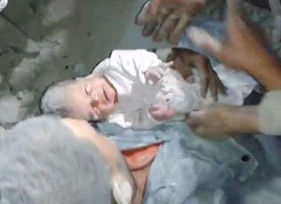 В городе Алеппо в Сирии спасателям удалось извлечь из-под завалов плачущего двухмесячного младенца после того, как он провел в ловушке целых 16 часов.