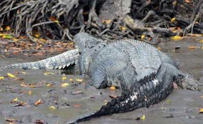 Прибыв на место, глазам Смита и его пассажиров открылась уникальная картина – у берега лежал большой крокодил, изо рта которого торчал хвост его меньшего собрата. Смит говорит, что по его оценкам, длина большего крокодила была около пяти метров, а меньшего, насколько можно судить по тому, что осталось непроглоченным, около трех.