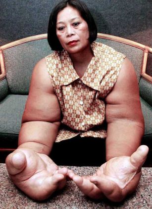 Более 50 лет жительница Таиланда, Дуанджай Самаксамам (Duangjay Samaksamam), страдает от редчайшей патологии - липоматоза - наследственного генетического заболевания, характеризующегося образованием жировой ткани на туловище и конечностях. Непрерывный рост липом привел к тому, что на руках женщины образовались огромные жировые отложения - каждая ее рука весит почти 10 кг.