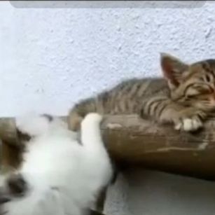 Очень скучно котенку одному, когда брат спит. Не поиграть, не похулиганить. Что делать? Конечно, будить. Но не так-то это просто - поднять того, кто не желает просыпаться. Приходится и за нос укусить, и за лапу подергать.