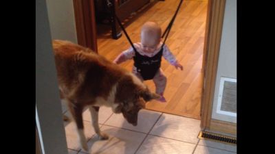 Собака учит малыша прыгать