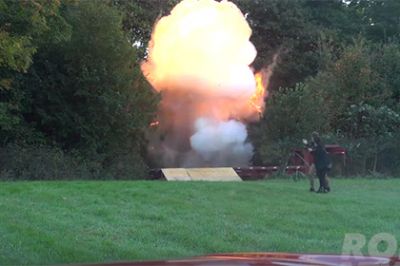 Радиоуправляемая машина тронулась с места, на большой скорости подлетела на трамплине и исчезла из виду, после чего раздался взрыв, пламя от которого поднялось на девять метров вверх.