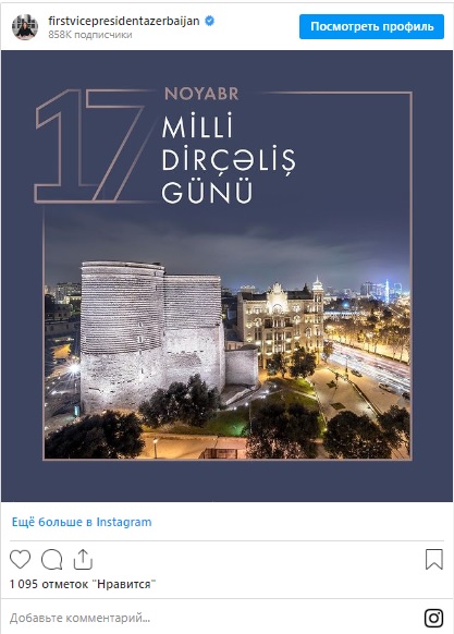 Первый вице-президент Азербайджана Мехрибан Алиева поделилась публикацией в связи с 17 ноября - Днем национального возрождения.