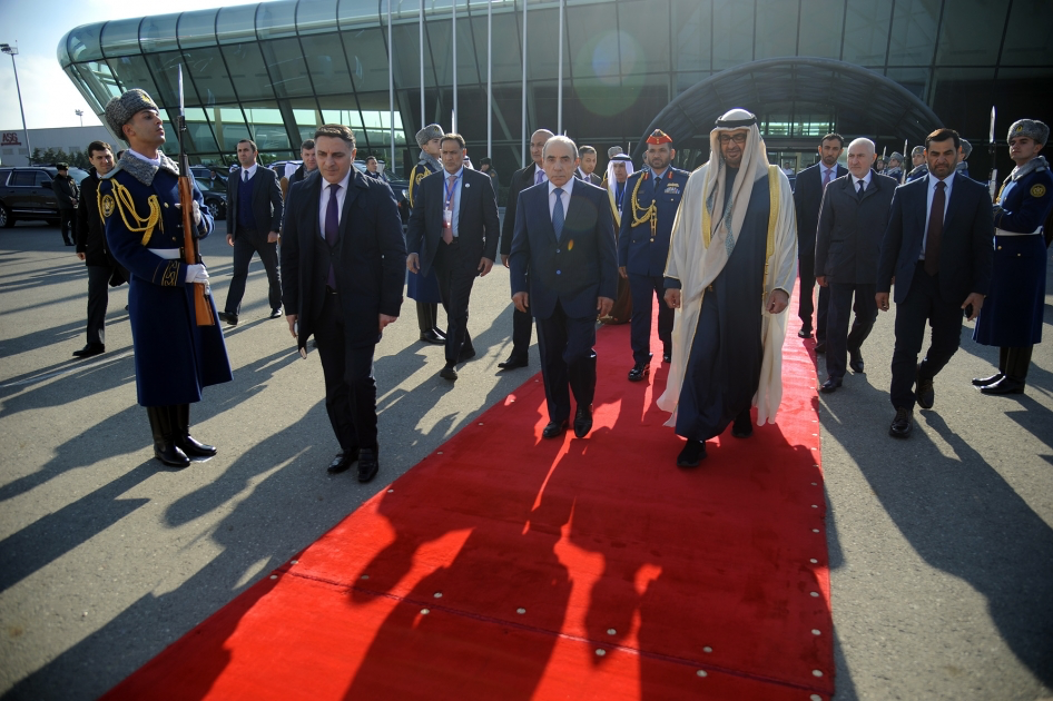 Президента Объединенных Арабских Эмиратов Шейха Мухаммеда бен Заида Аль Нахайяна провожали первый заместитель премьер-министра Азербайджанской Республики Ягуб Эйюбов, заместитель министра иностранных дел Ялчин Рафиев и другие официальные лица.