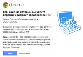 Сайт информационного агентства REGNUM заблокирован интернет-браузерами Google Chrome и Safari. При попытке зайти на главную страницу ресурса 10 декабря отображается сообщение о том, что "посещение сайта может нанести вред компьютеру".