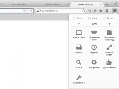 В верхнем правом углу окна, по аналогии с программой Google, расположена кнопка с изображением трех полосок для доступа к наиболее востребованнным функциям браузера. В одном меню сгруппированы приватный просмотр, журнал, печать, поиск, полноэкранный режим, дополнения, настройки, изменение масштаба веб-страницы и другие инструменты. Содержимое панели можно изменять, перетаскивая туда нужные кнопки и удаляя лишние.