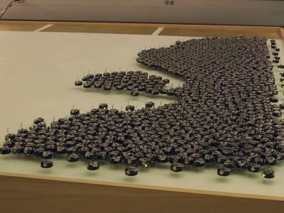 Компания роботов способа самостоятельно составлять из своих тел различные геометрические формы, буквы и так далее. При этом, каждый из роботов действует не на основе жестких централизованно заданных алгоритмов, а ориентируется на действия своих соседей по "толпе". Благодаря этому добавлять новые сложные структуры можно, не прописывая для каждой конкретной машины алгоритм поведения.