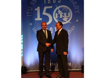 После выступления генеральный секретарь Хоулинь Чжао наградил выступающего в качестве золотого партнера Азербайджан и министра Али Аббасова золотой медалью и сертификатом за большой вклад в мероприятиях, посвященных 150-летнему юбилею МСЭ и за личный вклад в развитие информационно-коммуникационных технологий.