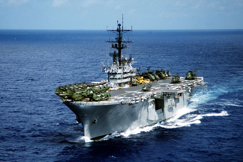 Американский десантный корабль USS Iwo Jima вместе с сопровождающими судами приближается к острову в Венесуэле.